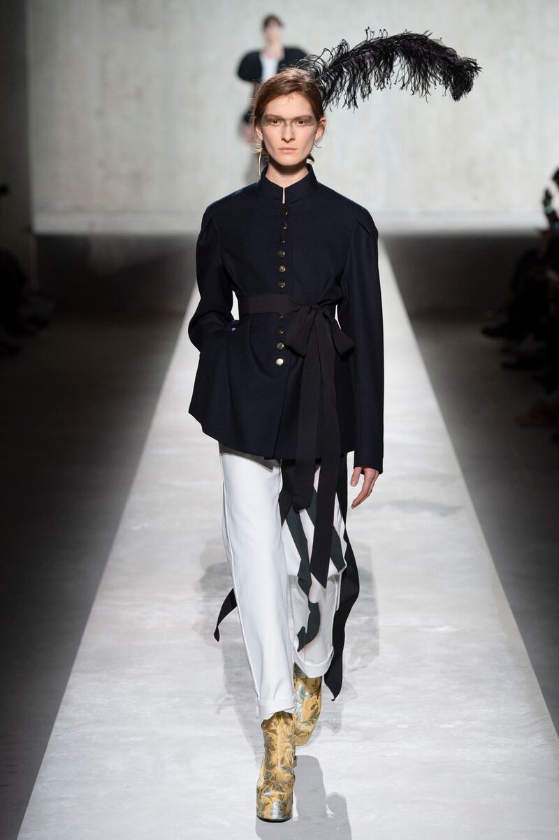 The spring collection offered the choice of being daring – an orange tiger print floor-length coat – or more demure – with a severe black jacket and white trousers. But with its rich detail and playful combinations, this collection at its heart was one of the season’s most romantic and joyful. At an emotional finale, both designers, hand-in-hand, took their bow to loud cheers and roars of approval.