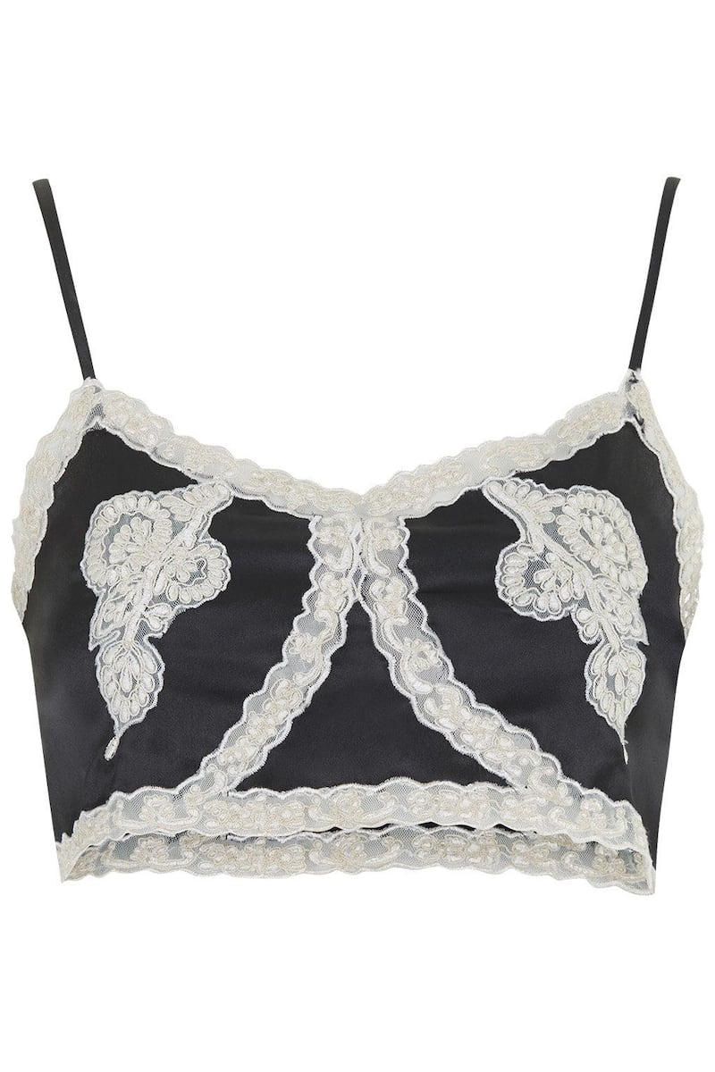 Embroidered slip top, €29, Topshop. Derek Rose of London silk pajamas, €450. Hanro lace detail vest, €36 at Brown Thomas