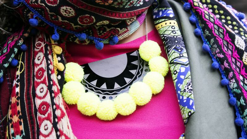 The geometric and pompom necklace is from Emmylou Jewellery (€50). My bangles and earrings I’ve acquired from all over the shop throughout the years. How would you describe your personal style? Most people who know me might say colour is my thing and plenty of it. Pom poms, fringing and neon, gimme it!
