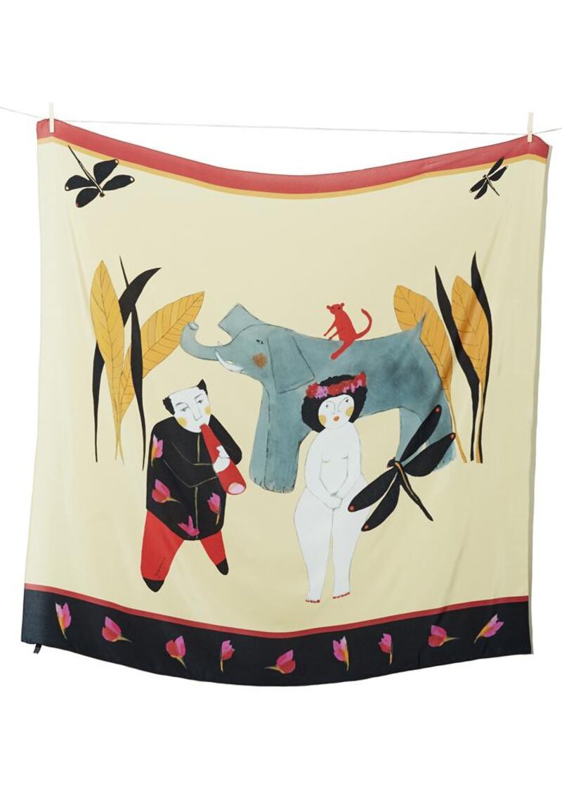 All have her signature lighthearted touch as in this one from her latest collection called "In Search of Magic". The scarves, from €180-€240 and can be had from her website www.jokamin.com
