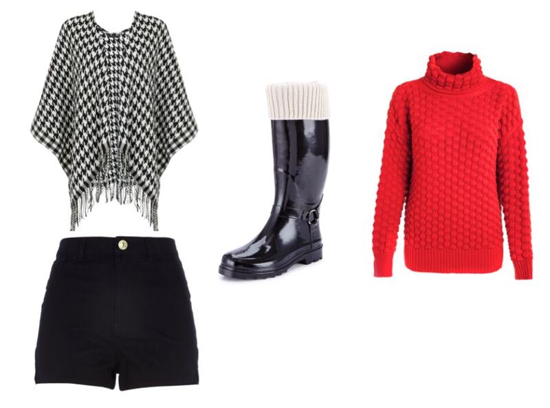 Dogtooth Blanket Scarf €24.99; NEW LOOK, Red Herring Jumper €52.50; DEBENHAMS, Black High Waisted Stretch Shorts €30; RIVER ISLAND, Show Box Olivia Wellington Boots with Knit Cuff €26; LITTLEWOODS IRELAND