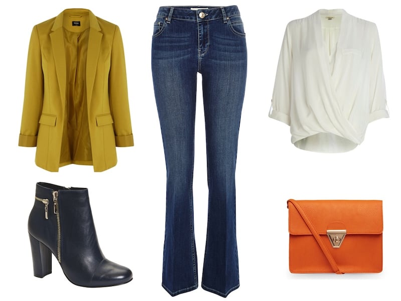Blazer €50.00; OASIS, Ream wrap front roll sleeve blouse €40.00; RIVER ISLAND, Mid-wash alice kick flare jeans €68.00; RIVER ISLAND , Double Gusset Lock X Body Orange €11.00; PENNEYS, Zip detail ankle boots €107.00; NEXT