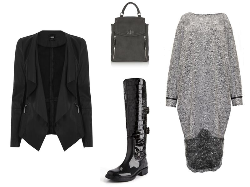 Black jacket €62.00; OASIS, Posh Wellies Seraphina Croc Boots €90; Littlewoods Ireland, Rocha Oversized Baggy Knit €38; ICLOTHING, Dora Backpack; OASIS