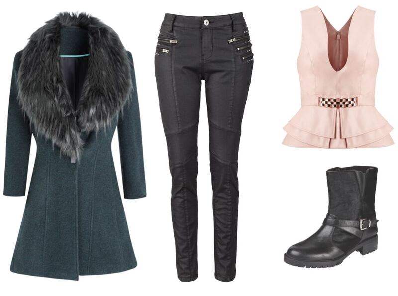 Red Herring green faux fur coat €133.50; DEBENHAMS, Trim Peplum Top €59.99; LIPSY, Black Pony Mix Biker Boots €110; NEXT, Fearne Cotton Skinny Jeans €50; LITTLEWOODS IRELAND