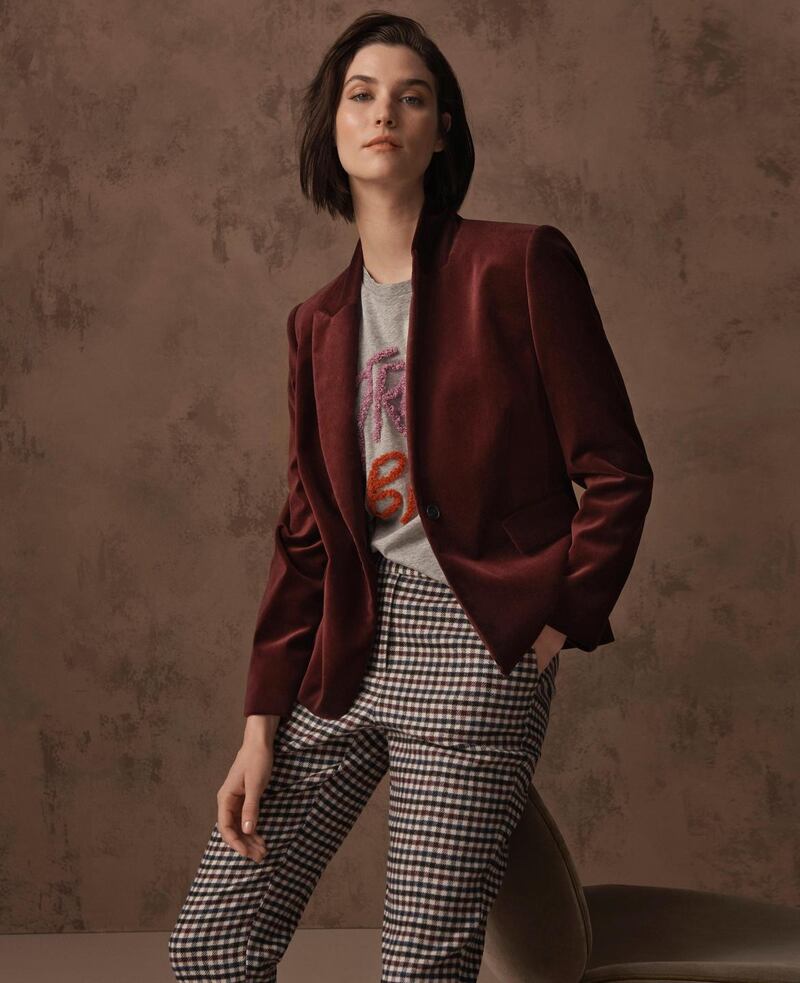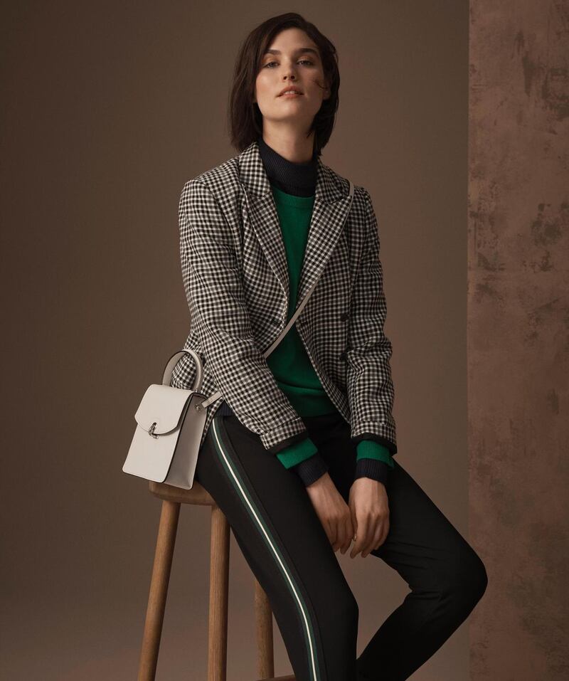 Dressed in slim black trousers striped with gold lurex and a soft white blouse with long cuffs from Autograph, she said “our clothes have to work harder than ever and have to slot into what we have in our wardrobes. If you buy a suit, split it up and wear the jacket with jeans and wear the trousers or skirt in different ways – that’s value for money,” is her advice.