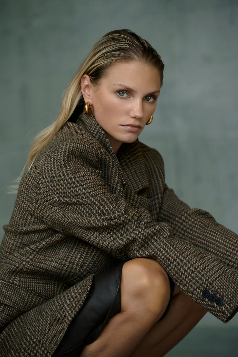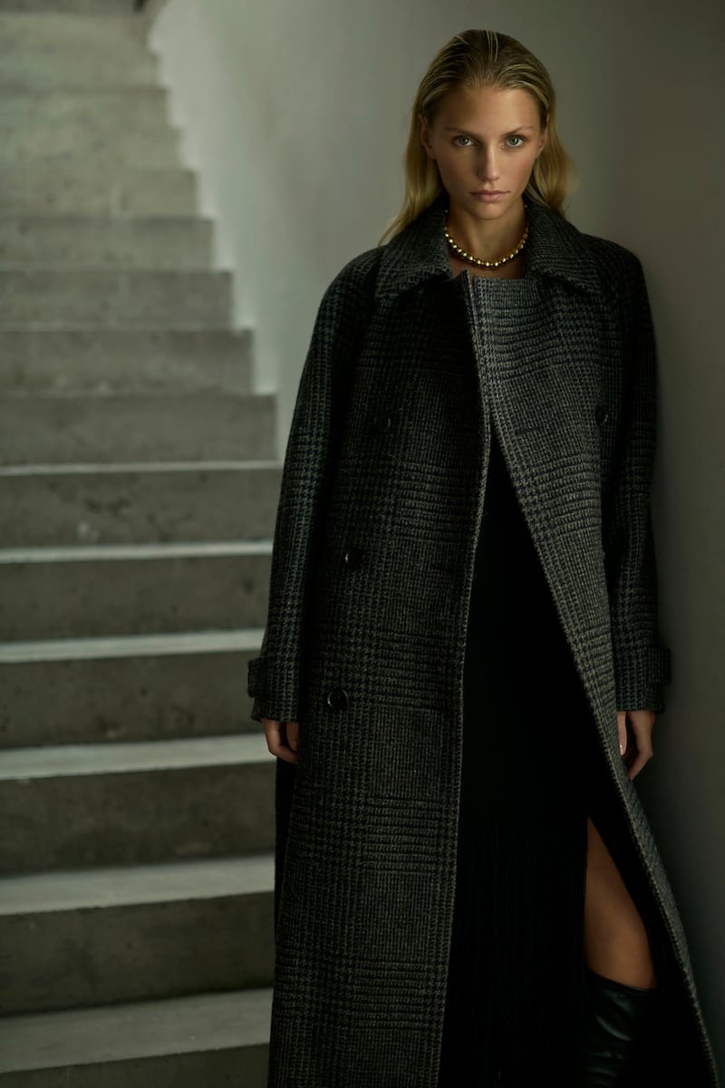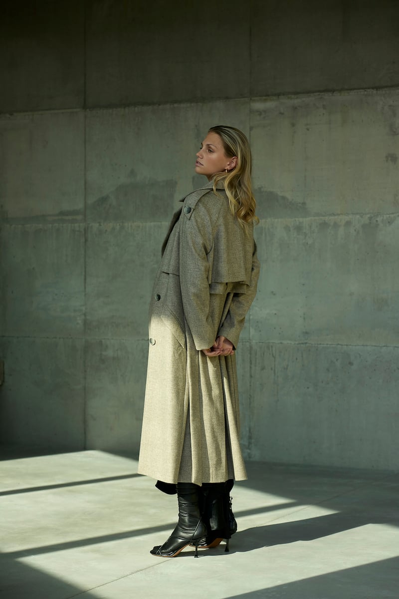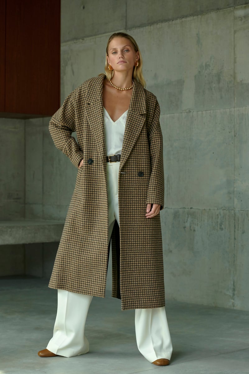 Pieces include a longline, oversized, belted trench coat in 100 per cent Irish twill, a double-breasted coat with amplified sleeves in oversized check, a longline coat with extended collar and lapel in camel and dove-blue Irish tweed and an oversized blazer in black and ecru herringbone.