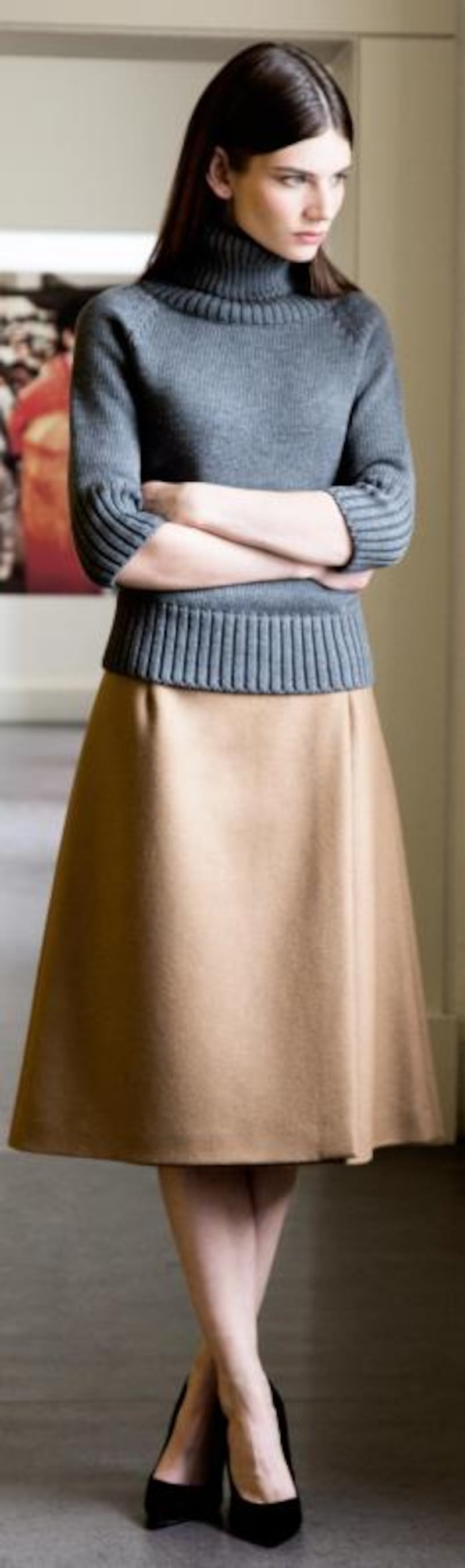For winter, apart from coats and a little New Look jacket in heavy wool Melton, there are navy cropped tops with wrap skirts, mannish jackets with wide leg trousers (a familiar O Brien silhouette) and knits with oversize cuffs. The dresses are spare and elegant, some in wool and velvet and others that look like two pieces.