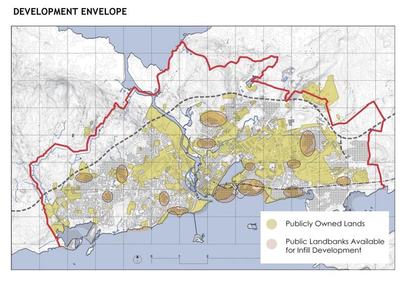 He sees room to incrementally grow the amount of housing land, saying the current 70 hectares (173 acres) can be expanded over decades to 95 hectares (235 acres). Higher densities mean Renmore could eventually accommodate some 7,780 people. The area already has a community centre, a primary school and a church, but “better community facilities” will be needed as it grows.