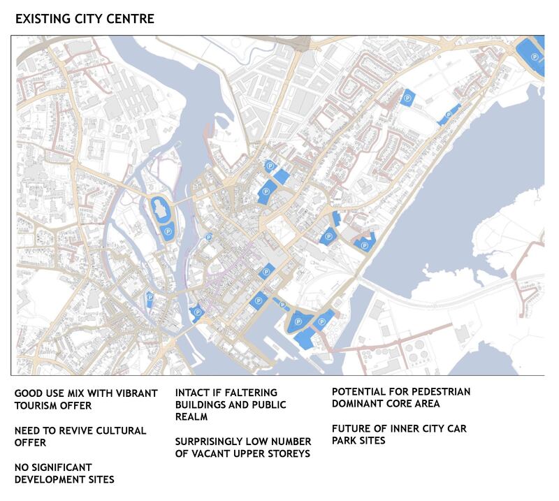 The Galway 2070 plan assumes the city can develop around its medieval core in future decades, but with higher densities in the central zone and considerably less motor traffic.
