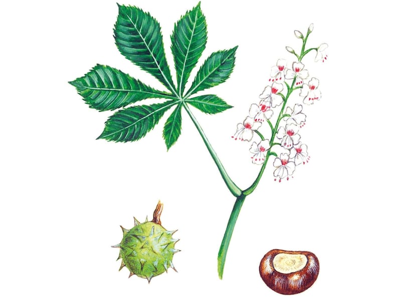 Faoi mhí na Bealtaine bíonn bláthanna bána air. Déanann na beacha mil dheas ón neachtair agus pailníonn siad iad. Faoi lár an tsamhraidh bíonn torthaí glasa deilgneacha air a mbíonn na cnónna nó "conkers" iontu. Nuair a aibíonn siad san fhómhar bíonn dath donn lonrach ar na cnónna. Ní féidir linn iad a ithe, ach itheann an fia iad. Airde: suas le 30m