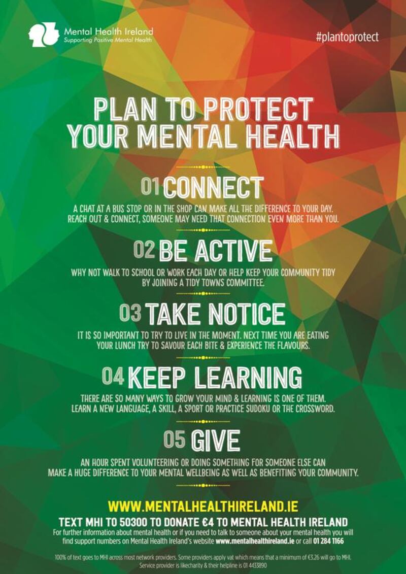 Mental Health Ireland’s campaign, “Plan to Protect your mental health and wellbeing” celebrates World Mental Health Day by outlining five steps everybody can take to protect their mental health and wellbeing. These are: