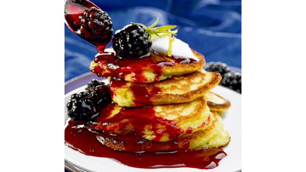 Put all the batter ingredients in a processor and whizz until blended. Heat a non-stick pan and add a touch of butter. Add four large spoonfuls of batter, spaced well apart, and cook for two minutes until bubbles appear; flip and cook for another minute. To make the sauce, heat the fruit, honey and lemon juice until you have a thick, fruity sauce.