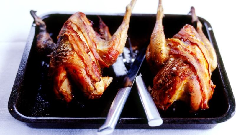 Carve the birds, removing the legs first, then neatly cut the breasts from the carcasses and place them on a roasting tray and cover with butter or greaseproof paper. Pop the jointed birds in a hot oven, 220 degrees/gas 8, for one or two minutes. Then trim the breasts and slice them on the bias and diagonally.
