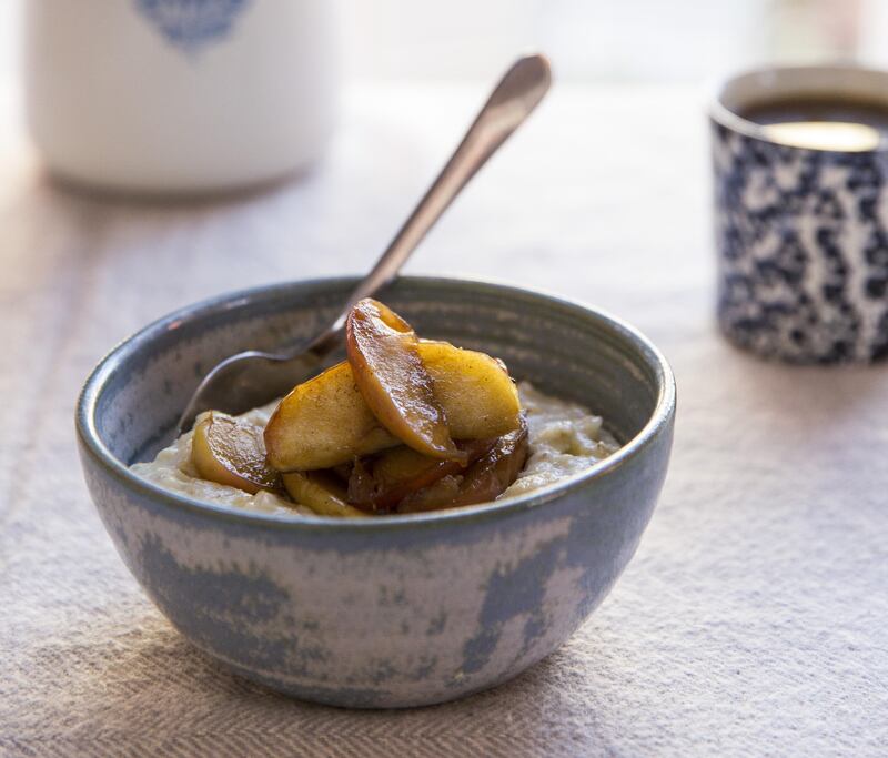 To serve, spoon porridge into two bowls, top with buttered apples and syrup.