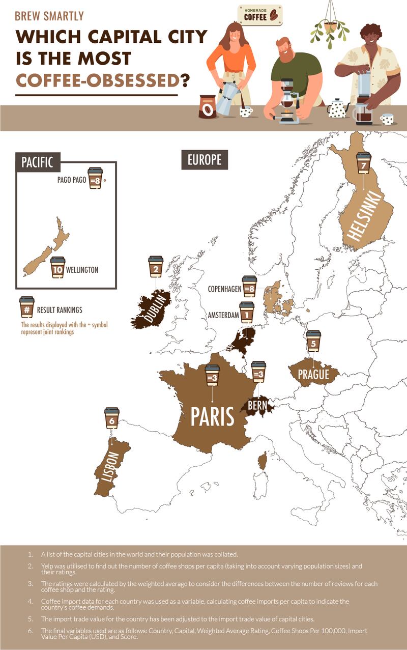 Most cities in the top 10 are in Europe, making the continent the most coffee-obsessed in the world, according to BrewSmartly. Just two of the top 10 are outside of Europe, with Pago Pago taking joint-eighth spot with Copenhagen, and Wellington in New Zealand rounding off the list at number 10.