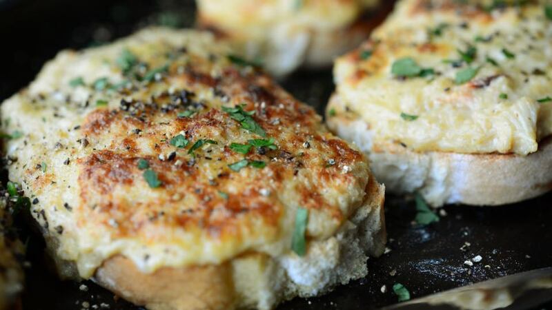 It is best to eat this crab rarebit dish, which is part souffle, part rarebit, while it is still warm and bubbling from being under the grill. I let some leftovers go cold and served them later to hungry colleagues at a wine tasting and they were a bit tough and chewy. If you want to really impress someone, it is best to get up early some morning and make this as a delicious brunch dish when you can’t quite get it together to make an omelette Arnold Bennett (as if anyone can), or when smoked salmon and scrambled eggs seem a bit dull. It is also equally satisfying with a big green salad and a glass of something deliciously cool and crisp.
