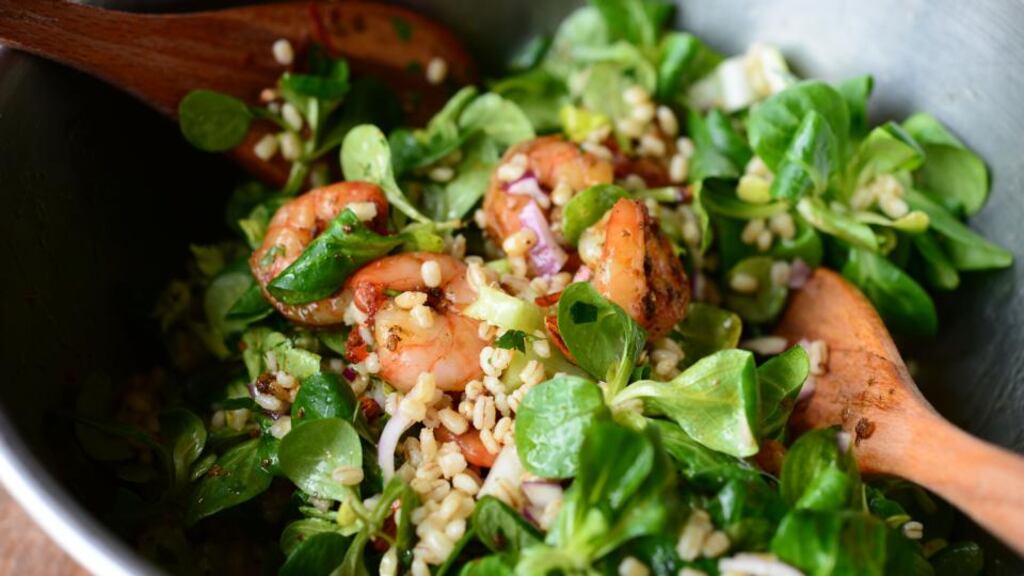 The prawn and barley salad is perfect with warmer weather approaching, when the possibility of eating a meal outside is starting to wink at you. You could happily ditch the prawns and exchange them for some fried chunks of haloumi, which you can just chop into slices and fry in a little olive oil and, if no one is looking, a tiny bit of butter, until golden brown. If time is of the essence, some hunks of feta will do.