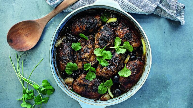 Remove the pan from the oven, check that the chicken is cooked through and scatter with the chopped coriander.
