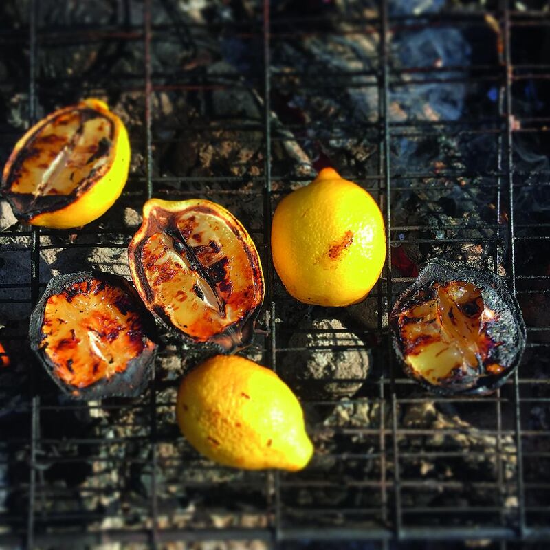 - Cut the lemons in half and place cut-side down over the fire on the grill.