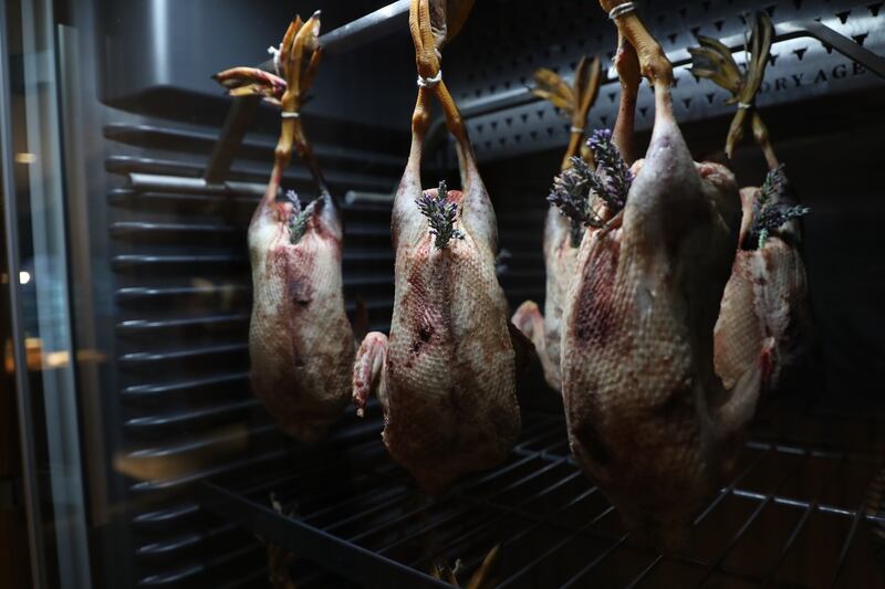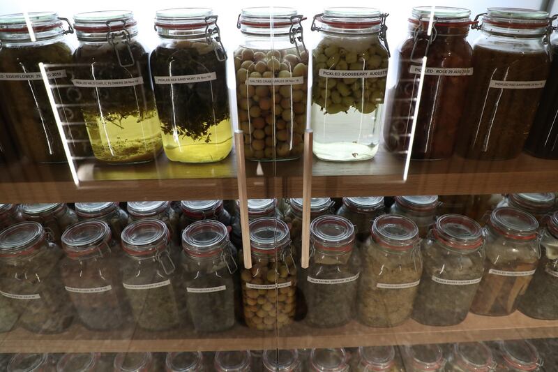 A corridor – more a runway, really – leading from the bar to the restaurant is lined with cabinets behind which wines are chilling, and meat and fish are ageing. Pickles and preserves are also on display, a giant botanical jewellery box of bottles and jars glinting in the subdued light.