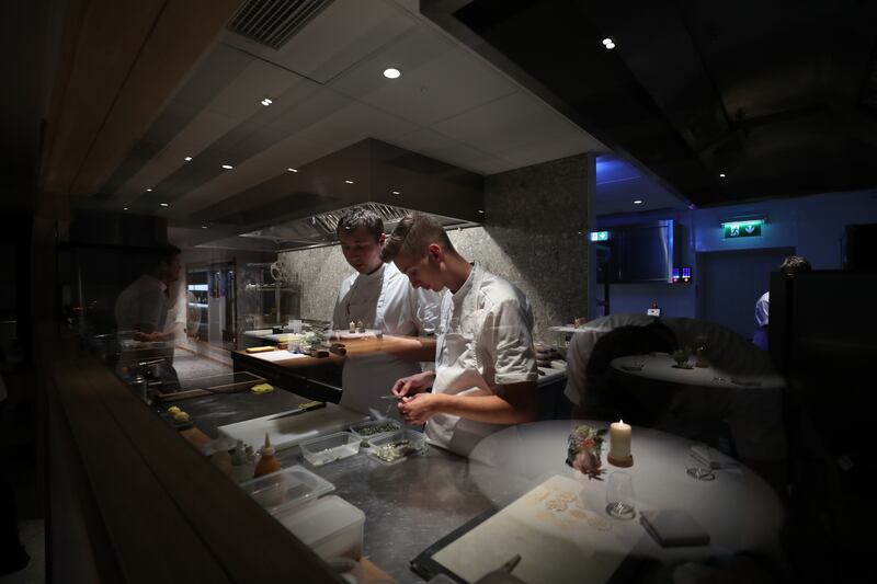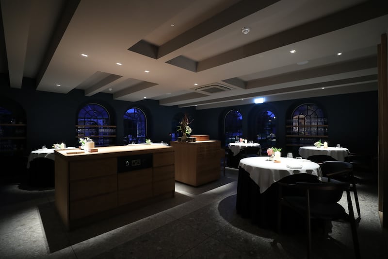 “This is the dream,” Bailey says, surveying the dining room, with its midnight-blue walls on one side and gold-flecked beige on the other, bespoke Irish-oak furnishings and smoked-oak and limestone floors. The kitchen – they call it the “cooking suite” – is partially exposed, visible through glass from counter level up. Six generous circular tables are dotted around the room, which is dominated by the two handcrafted oak workstations. From one Bailey and his team – with their tweezers – will put the finishing touches to their dishes; from the other Bech-Bailey and her team will orchestrate the front-of-house and drinks service.