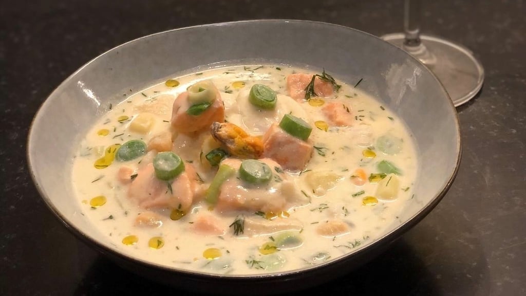 This is a simple, delicious seafood chowder recipe inspired by my girlfriend's hometown of Dungarvan. When we visit there, we often eat at The Moorings bar, which in my opinion makes the best chowder in the world.
