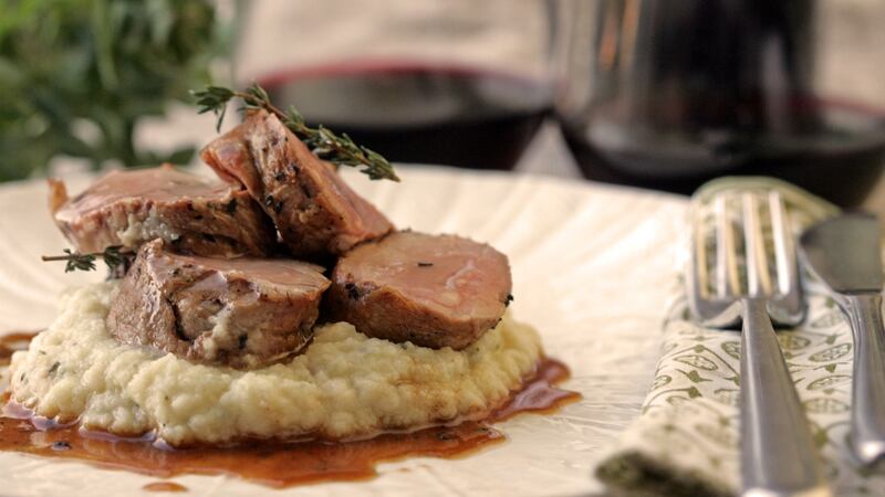 Preheat an oven to 180 degrees/gas 4. To cook the pork, heat the butter and a good splash of olive oil in a large frying pan until it is foaming. Fry the fillets on a high heat, ensuring a good, high sizzle. Season well and fry them until well coloured on all sides. Then deglaze the pan with the wine (be careful of flames) and add the chopped garlic and thyme. Spoon and baste the fillets in the juices and transfer them to a roasting tray. Roast in the oven for about 15 minutes.