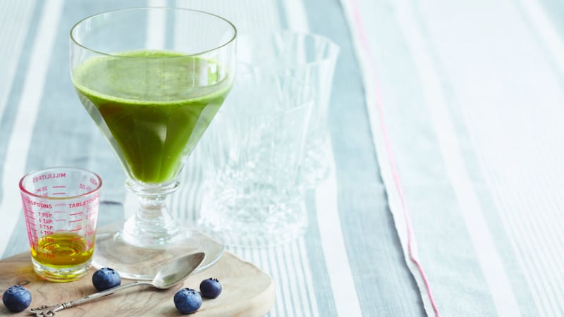 Juice the fruit and vegetables, then stir in the chia oil and serve.