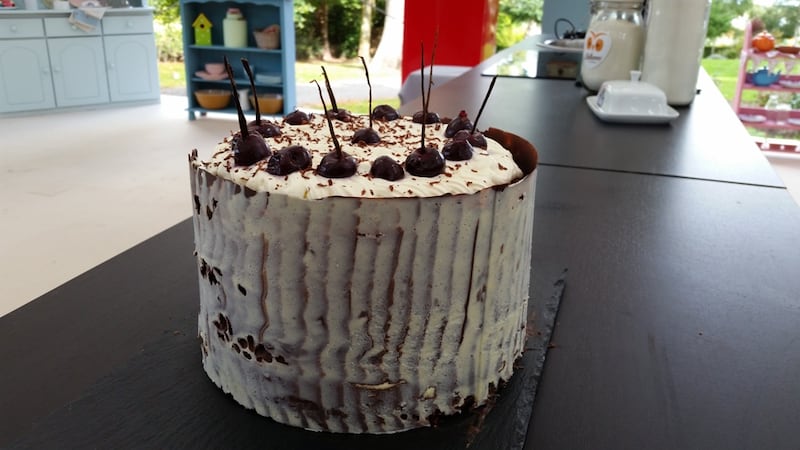 "This is Bake Off, though, so a traditional Black Forest wasn't going to cut it. I designed what I thought would be a great modern twist on this 1970s classic. A rich, heavy chocolate sponge, white chocolate and Kirsch mouse and a dark chocolate and Kirsch ganache would give the flavours and contrasting textures I wanted. This was all fine in practice, as my myhome.ie and Irish Times colleagues will attest to, as it disappeared quite quickly.