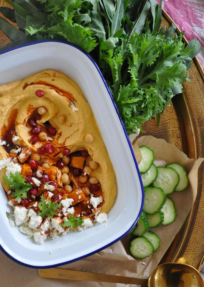 Here, I’ve roasted butternut squash and blitzed it through the hummus. Once roasted, the squash becomes caramelised and sweet at the edges and is nicely balanced by the tahini and lemon.