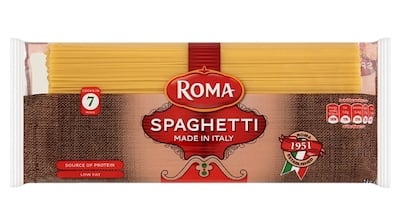 There is often only one ingredient. Roma spaghetti, for example, is made from durum wheat semolina, a coarse flour. It is popular because, thanks to the gluten, it holds together well. (Semolina can also be bought as a powder and used to make pudding, for a taste of 1970s Ireland.) The products are produced and packed in Italy for Irish group Valeo Foods in Dublin, which is why there is an Italian flag on the front of the packet.