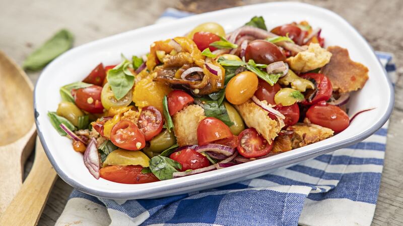 A Tuscan bread salad is a staple of our summer. It’s also brilliant as a starter or light lunch with some mozzarella, feta or goat’s cheese. You can buy roasted peppers for a quick cheat.