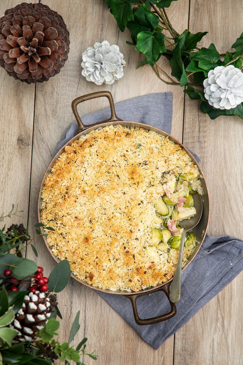 6 Mix the breadcrumbs with the lemon zest, melted butter, sage, and Gruyère cheese. Season with salt and pepper and sprinkle over top of sprouts.
