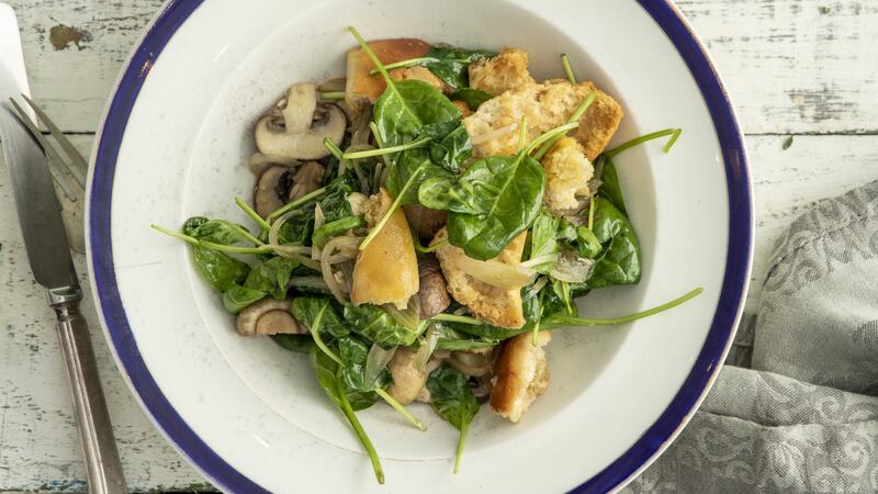 MUSHROOM, ROASTED BREAD AND SPINACH SALAD