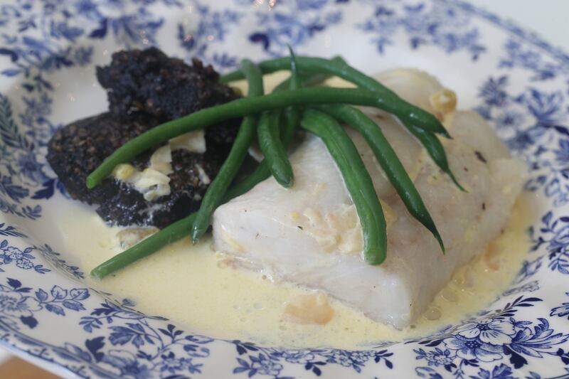 HAKE WITH ROASTED GARLIC CREAM AND BLACK PUDDING