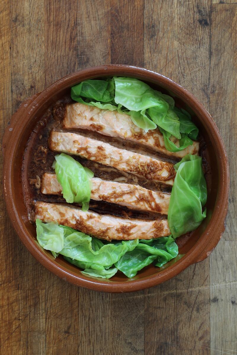 7 Serve the salmon with the cabbage and rice, then pour over the delicious garlicky, ginger juices.