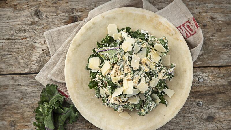 6 Add the dressing, breadcrumbs and Parmesan to the kale and serve on a platter for sharing.