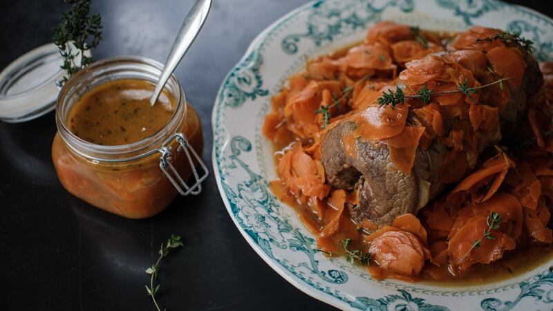 Turn the heat down to a gentle bubble, checking it every half hour, adding the rest of the carrots in three batches and topping up the liquid level with more stock. It will need at least 1½ hours and maybe a half an hour extra depending on the thickness of the joint.