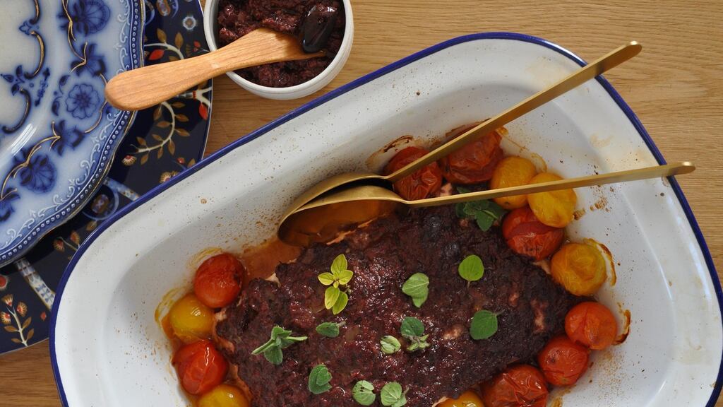 Make a little space in the centre and sit the salmon skin side down in the tray. Mix the tapenade and sambuca together in a little bowl. Spread this over the salmon in a thick layer.