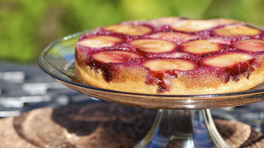 7. To remove the cake from the tin, place a plate over the top of the tin and invert the cake so the plums are on the top. Remove the tin and peel away the paper lining.