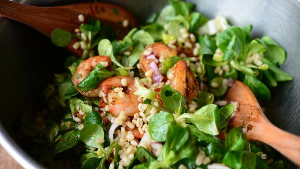 - <ul> <li>200g pearl barley</li> <li>1 cinnamon stick</li> <li>Juice of 2 lemons</li> <li>Juice of 1 lime</li> <li>100ml olive oil</li> <li>2 tsp ground cumin</li> <li>Salt and pepper</li> <li>Large bunch coriander </li> <li>Large bunch flat leaf parsley</li> <li>1 red onion, peeled and finely diced</li> <li>1 head celery, finely chopped</li> <li>500g frozen prawns, defrosted and drained</li> <li>Good knob butter</li> <li>1 tbsp sumac or za’atar spice</li> <li>2 cloves garlic</li> <li>Sprinkle dried chilli flakes</li> <li>125g (approx) mache or lamb’s lettuce</li> <li>120g (approx) flaked almonds, toasted</li> <li/> </ul>