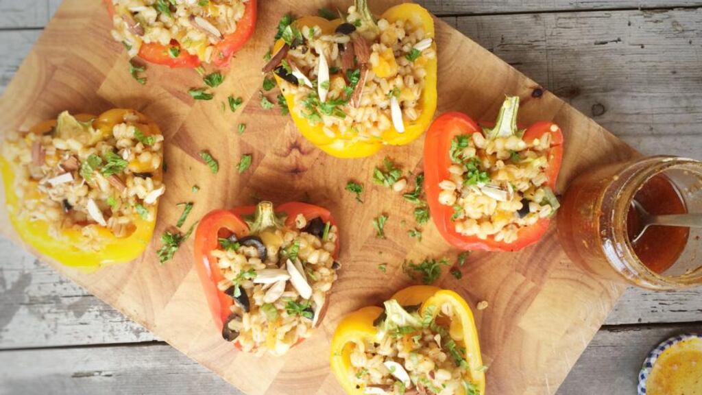 These stuffed peppers have a Moroccan twist with the addition of dried apricots, black olives, fresh mint and parsley served with a sweet and smoky dressing starring honey, sweet smoked paprika and cinnamon.