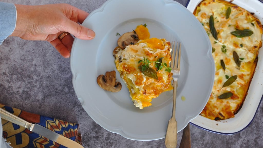 6. Next add a layer of pasta sheets followed by the remaining squash puree and mushrooms. Add a final layer of pasta and finish with the ricotta. Dot with slices of mozzarella and sprinkle with grated Parmesan.
