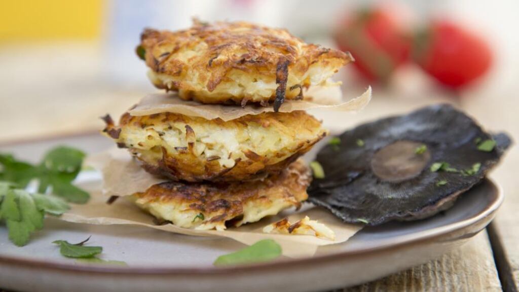 Transfer the rosti to an oven tray lined with parchment paper. Place a mushroom on top of each rosti, dome side up. Sprinkle with sea salt and bake for 20 minutes.