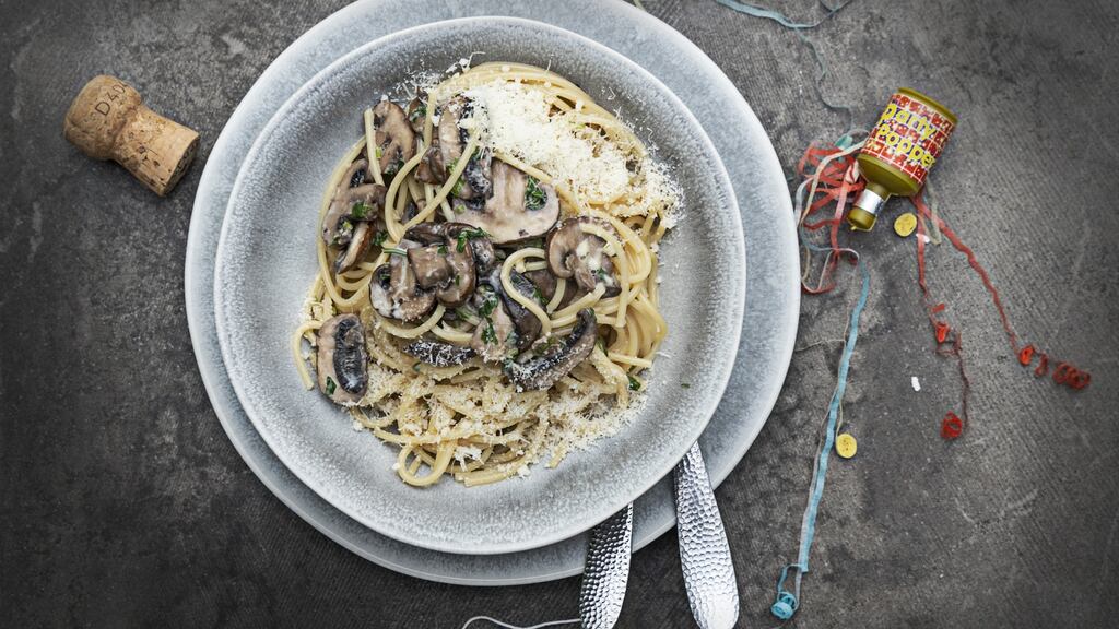 6 Stir the spaghetti so the egg mixes and thickens but doesn't scramble, and mix the mushrooms through.