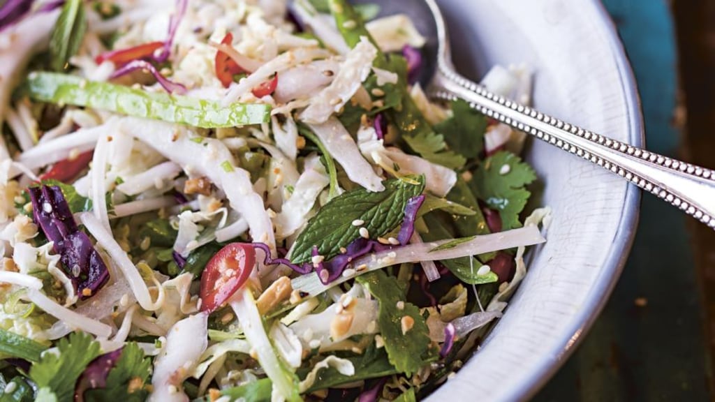 Whisk the dressing ingredients in a bowl. Taste to check the seasoning. Pour the dressing over the chilled vegetables and mix well. Now add the chilli, chopped herbs and sesame seeds and toss through. Allow the flavours to come together in the fridge for 1 hour. Just before serving, sprinkle over the toasted crushed peanuts.