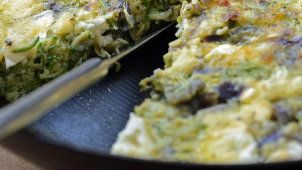 - <ul> <li>4 courgettes, grated</li> <li>100ml olive oil</li> <li>2 red onions, peeled and diced</li> <li>Grated nutmeg</li> <li>1 good tsp dried mint</li> <li>8-10 eggs, beaten</li> <li>Zest of 1 lemon</li> <li>Salt and pepper</li> <li>200g soft goat’s cheese</li> </ul>