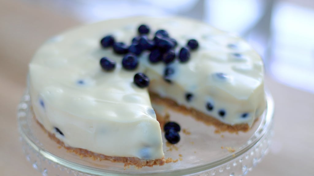 This is a real treat and certainly not one for anyone counting the calories. This cheesecake requires no baking and the combination of sweet white chocolate and blueberries is superb. Use the best quality white chocolate you can get your hands on, and although I suggest blueberries here, strawberries make an equally nice alternative. Bash the biscuits in a resealable bag with a rolling pin, or any other blunt instrument you can do serious damage with, until you have fine crumbs.