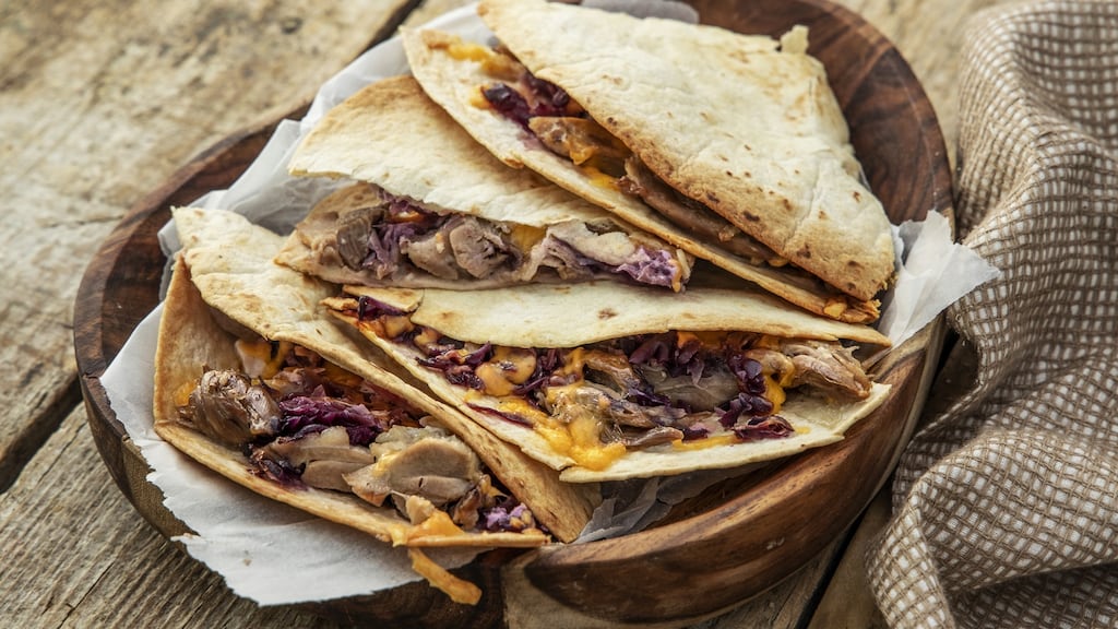 2 Spread the sour cream evenly on the tortilla, then scatter over the duck, cheese and cabbage. The objective is to make sure they are thinly filled and don't fall apart.