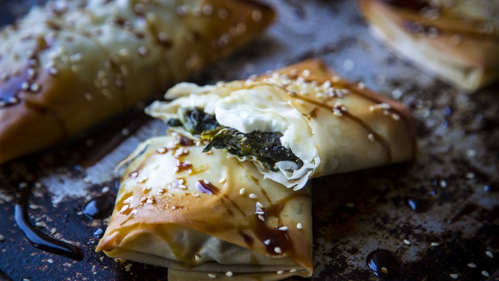 Season with sea salt and black pepper and wrap up in the filo pastry, using a brushing of olive oil to seal.